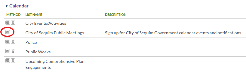 From the Notify Me page, scroll down to Calendar and click the envelope next to City of Sequim Public Meetings, and follow the prompts